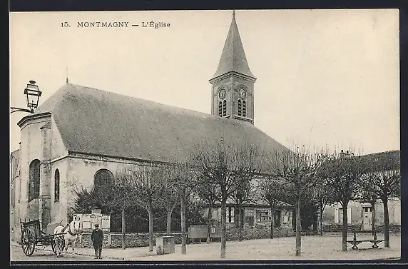 AK Montmagny, L`Église et scène de rue avec calèche et passants