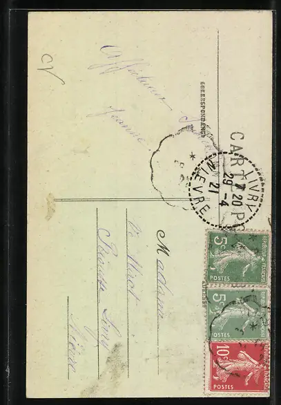 Personenbezogene Daten auf der Rückseite der Karte wurden durch blauen Textmarker unkenntlich gemacht. Die blauen Stellen sind auf die Vorderseite durchgeweicht und wirken sich negativ auf das Postkartenfoto aus