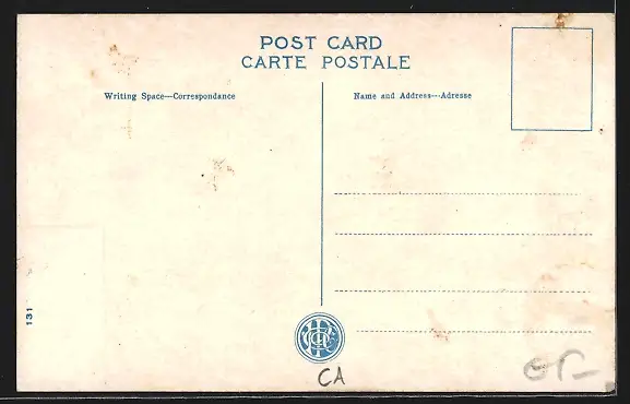 Personenbezogene Daten auf der Rückseite der Karte wurden durch blauen Textmarker unkenntlich gemacht. Die blauen Stellen sind auf die Vorderseite durchgeweicht und wirken sich negativ auf das Postkartenfoto aus