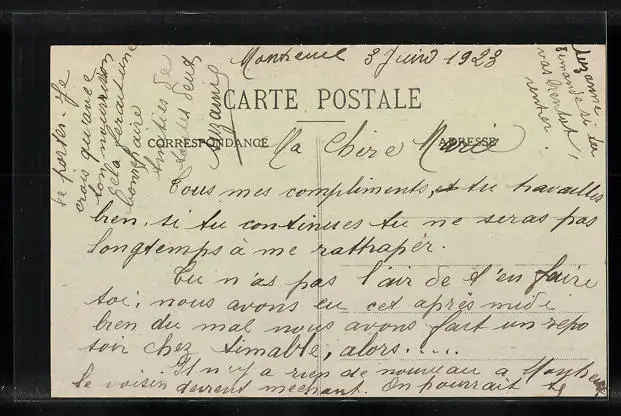 Personenbezogene Daten auf der Rückseite der Karte wurden durch blauen Textmarker unkenntlich gemacht. Die blauen Stellen sind auf die Vorderseite durchgeweicht und wirken sich negativ auf das Postkartenfoto aus