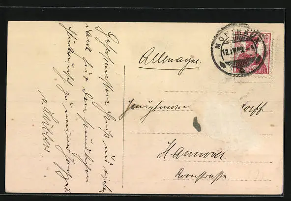 alte Ansichtskarte, gelaufen, rückseitig Oberflächenschaden, Stempelspur, guter Zustand