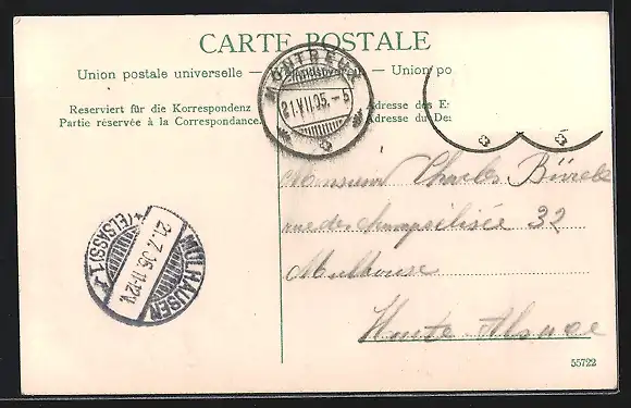 alte Ansichtskarte, gelaufen 1905, Briefmarke entfernt, rückseitig Oberflächenschaden, Stempelspur, guter Zustand