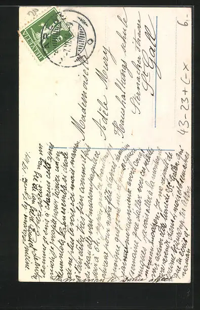 Personenbezogene Daten auf der Rückseite der Karte wurden durch blauen Textmarker unkenntlich gemacht. Die blauen Stellen sind auf die Vorderseite durchgeweicht und wirken sich negativ auf das Postkartenfoto aus