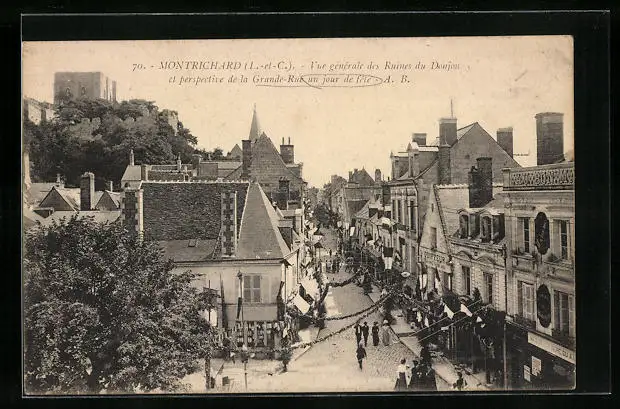 AK Montrichard, Vue générale des Ruines du Doujon, Grande-Rue un jour de fête