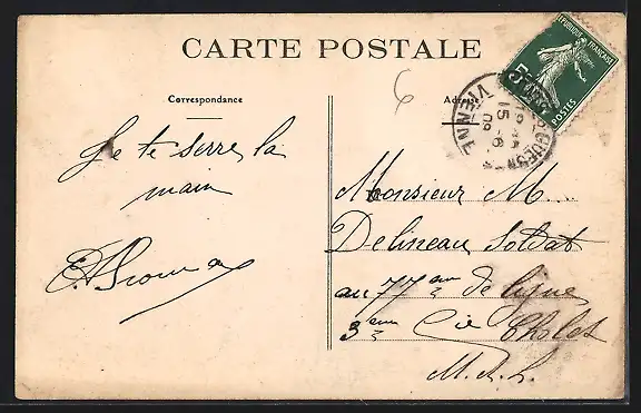 Personenbezogene Daten auf der Rückseite der Karte wurden durch blauen Textmarker unkenntlich gemacht. Die blauen Stellen sind auf die Vorderseite durchgeweicht und wirken sich negativ auf das Postkartenfoto aus