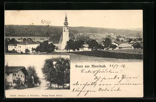 AK Moosbach, Gasthaus, Ortsansicht mit Kirche