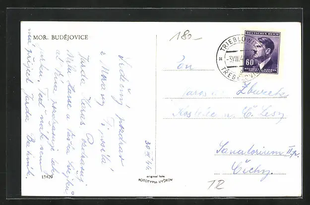 Personenbezogene Daten auf der Rückseite der Karte wurden durch blauen Textmarker unkenntlich gemacht. Die blauen Stellen sind auf die Vorderseite durchgeweicht und wirken sich negativ auf das Postkartenfoto aus