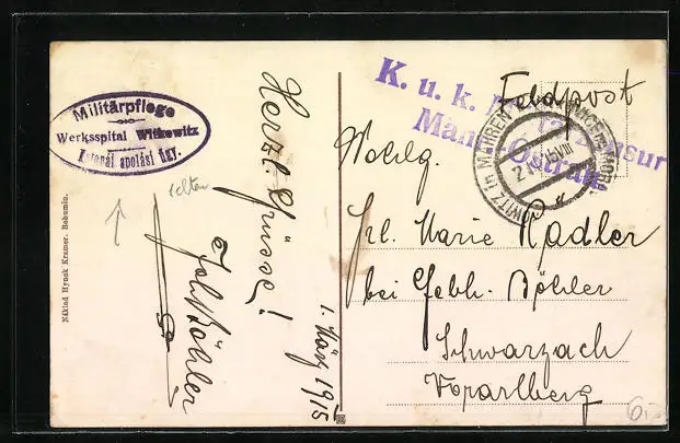 gelaufen 1915, Eckknick li. unten, Oberflächenschaden, guter Zustand
