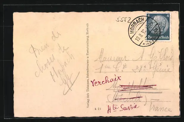 Personenbezogene Daten auf der Rückseite der Karte wurden durch blauen Textmarker unkenntlich gemacht. Die blauen Stellen sind auf die Vorderseite durchgeweicht und wirken sich negativ auf das Postkartenfoto aus