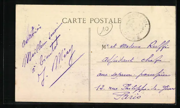 Personenbezogene Daten auf der Rückseite der Karte wurden durch blauen Textmarker unkenntlich gemacht. Die blauen Stellen sind auf die Vorderseite durchgeweicht und wirken sich negativ auf das Postkartenfoto aus