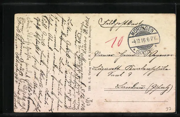 gelaufen als Feldpost 1916, Eckknick oben re., guter Zustand