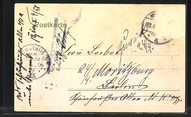 alte Ansichtskarte, gelaufen 1906, Briefmarke entfernt mit Oberflächenschaden, Ecken bestoßen, sonst guter Zustand
