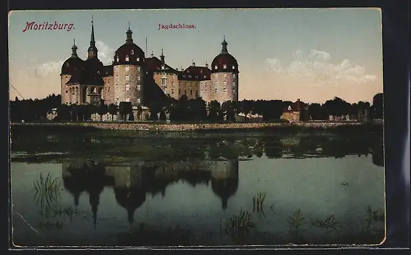 AK Moritzburg / Sachsen, Blick übers Wasser aufs Jagdschloss