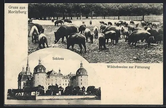 AK Moritzburg / Sachsen, Schloss, Wildschweine zur Fütterung