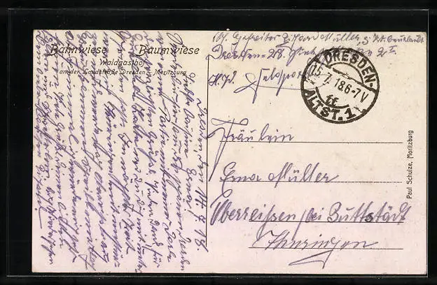 Personenbezogene Daten auf der Rückseite der Karte wurden durch blauen Textmarker unkenntlich gemacht. Die blauen Stellen sind auf die Vorderseite durchgeweicht und wirken sich negativ auf das Postkartenfoto aus