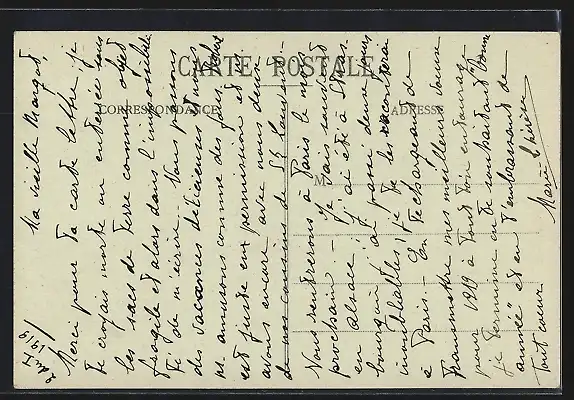 Personenbezogene Daten auf der Rückseite der Karte wurden durch blauen Textmarker unkenntlich gemacht. Die blauen Stellen sind auf die Vorderseite durchgeweicht und wirken sich negativ auf das Postkartenfoto aus