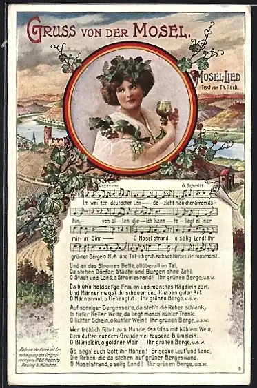 AK Mosel-Lied von Th. Reck, Weinkönigin, Weintrauben