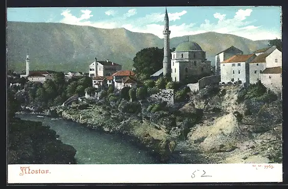 AK Mostar, Ortsansicht mit Flusslauf und Moschee