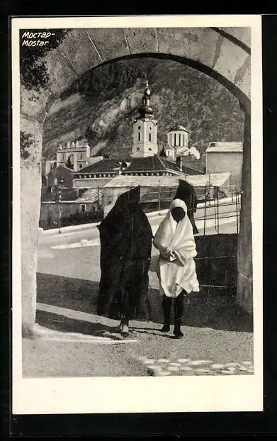 AK Mostar, Ortspartie mit Kirche und verschleierten Frauen
