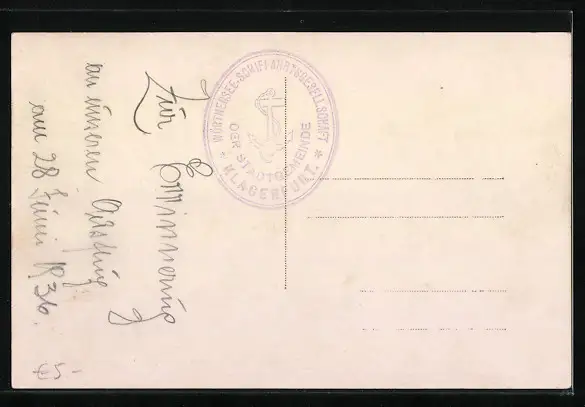 Personenbezogene Daten auf der Rückseite der Karte wurden durch blauen Textmarker unkenntlich gemacht. Die blauen Stellen sind auf die Vorderseite durchgeweicht und wirken sich negativ auf das Postkartenfoto aus