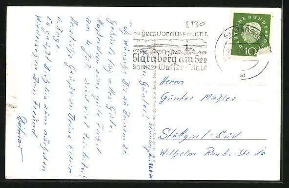 Personenbezogene Daten auf der Rückseite der Karte wurden durch blauen Textmarker unkenntlich gemacht. Die blauen Stellen sind auf die Vorderseite durchgeweicht und wirken sich negativ auf das Postkartenfoto aus