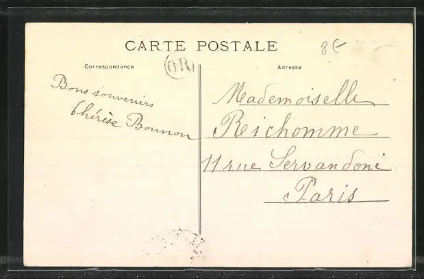 Personenbezogene Daten auf der Rückseite der Karte wurden durch blauen Textmarker unkenntlich gemacht. Die blauen Stellen sind auf die Vorderseite durchgeweicht und wirken sich negativ auf das Postkartenfoto aus
