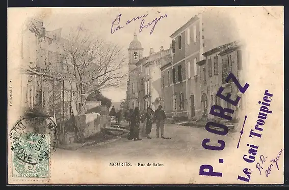 AK Mouriès, Rue de Salon avec passants et clocher en arrière-plan