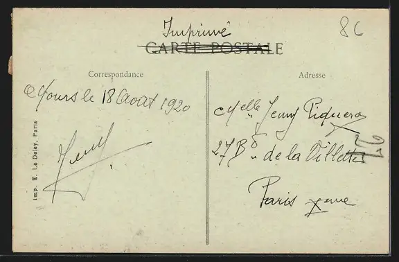 Personenbezogene Daten auf der Rückseite der Karte wurden durch blauen Textmarker unkenntlich gemacht. Die blauen Stellen sind auf die Vorderseite durchgeweicht und wirken sich negativ auf das Postkartenfoto aus
