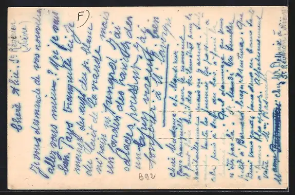 Personenbezogene Daten auf der Rückseite der Karte wurden durch blauen Textmarker unkenntlich gemacht. Die blauen Stellen sind auf die Vorderseite durchgeweicht und wirken sich negativ auf das Postkartenfoto aus