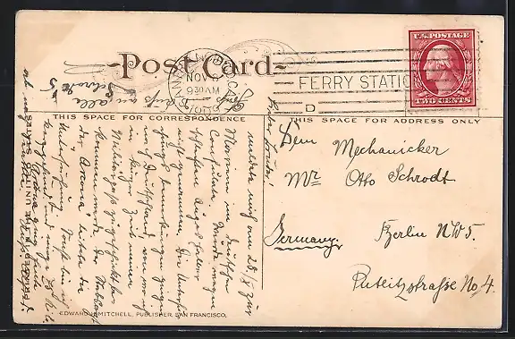 Personenbezogene Daten auf der Rückseite der Karte wurden durch blauen Textmarker unkenntlich gemacht. Die blauen Stellen sind auf die Vorderseite durchgeweicht und wirken sich negativ auf das Postkartenfoto aus
