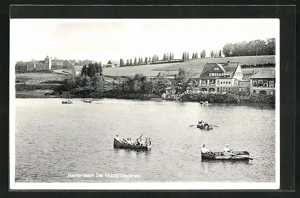 AK Much im Siegkreis, kleine Boote auf dem Herrenteiche, am Gasthaus