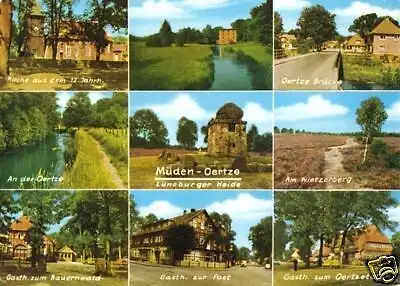 Ansichtskarte Müden - Oertze Lüneburger Heide neun Abb. Erhaltung I-II postalisch gelaufen, gestempelt: Müden (Oertze), 31.5.77 Verlag: Gisa-Postkartenverlag, 2056 Glinde b. Hbg.