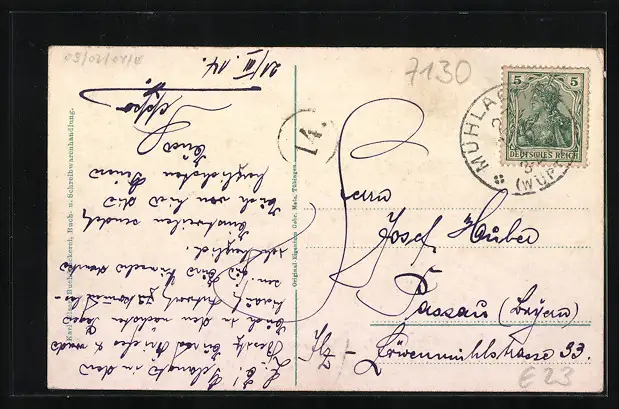 Personenbezogene Daten auf der Rückseite der Karte wurden durch blauen Textmarker unkenntlich gemacht. Die blauen Stellen sind auf die Vorderseite durchgeweicht und wirken sich negativ auf das Postkartenfoto aus