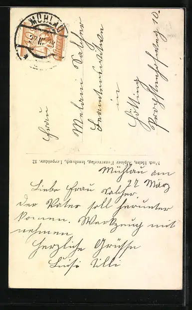 Personenbezogene Daten auf der Rückseite der Karte wurden durch blauen Textmarker unkenntlich gemacht. Die blauen Stellen sind auf die Vorderseite durchgeweicht und wirken sich negativ auf das Postkartenfoto aus