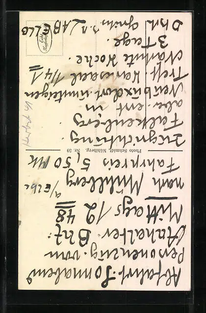 Personenbezogene Daten auf der Rückseite der Karte wurden durch blauen Textmarker unkenntlich gemacht. Die blauen Stellen sind auf die Vorderseite durchgeweicht und wirken sich negativ auf das Postkartenfoto aus