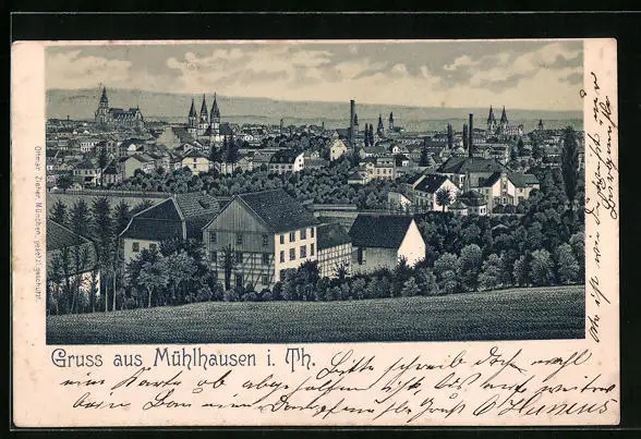 AK Mühlhausen i. Th., Ortsansicht mit Kirchen und Fabrikschornsteinen
