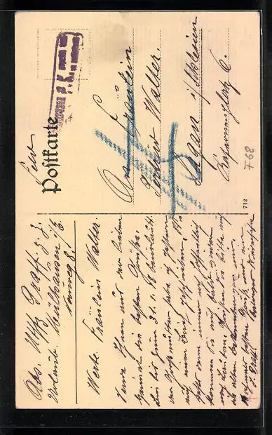 Personenbezogene Daten auf der Rückseite der Karte wurden durch blauen Textmarker unkenntlich gemacht. Die blauen Stellen sind auf die Vorderseite durchgeweicht und wirken sich negativ auf das Postkartenfoto aus