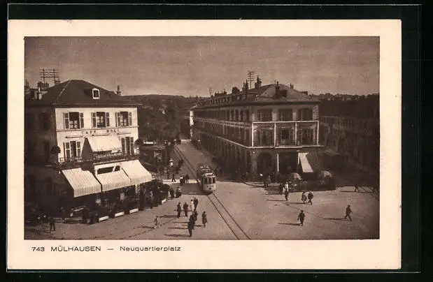 AK Mülhausen, Neuquartierplatz mit Strassenbahn