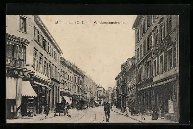 AK Mülhausen /O.-E., Wildemannstrasse mit Geschäften und Strassenbahn