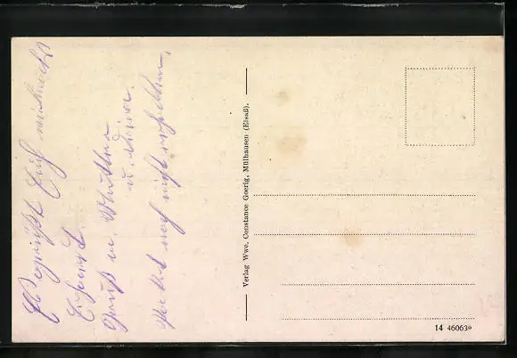 Personenbezogene Daten auf der Rückseite der Karte wurden durch blauen Textmarker unkenntlich gemacht. Die blauen Stellen sind auf die Vorderseite durchgeweicht und wirken sich negativ auf das Postkartenfoto aus
