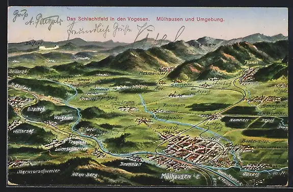 AK Mülhausen, Totalansicht mit Vogesen aus der Vogelschau