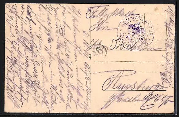 Personenbezogene Daten auf der Rückseite der Karte wurden durch blauen Textmarker unkenntlich gemacht. Die blauen Stellen sind auf die Vorderseite durchgeweicht und wirken sich negativ auf das Postkartenfoto aus