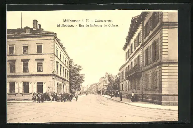 AK Mülhausen i. E., Colmarerstrasse mit Offizieren und Kindern