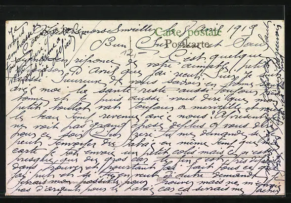 Personenbezogene Daten auf der Rückseite der Karte wurden durch blauen Textmarker unkenntlich gemacht. Die blauen Stellen sind auf die Vorderseite durchgeweicht und wirken sich negativ auf das Postkartenfoto aus