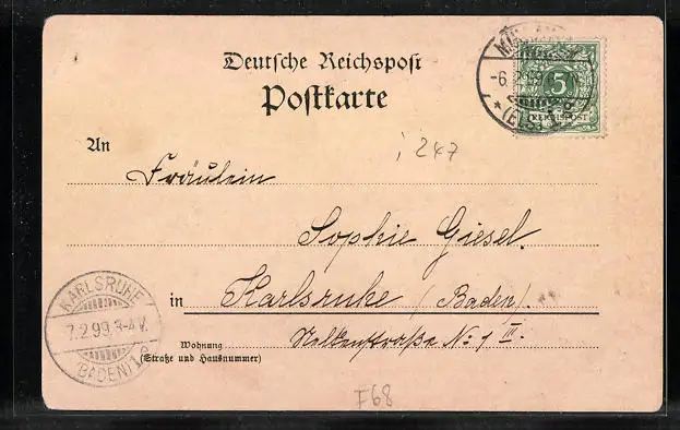 gelaufen 1899, Eckknick rechts oben, guter Zustand