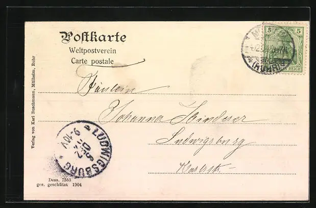 Personenbezogene Daten auf der Rückseite der Karte wurden durch blauen Textmarker unkenntlich gemacht. Die blauen Stellen sind auf die Vorderseite durchgeweicht und wirken sich negativ auf das Postkartenfoto aus