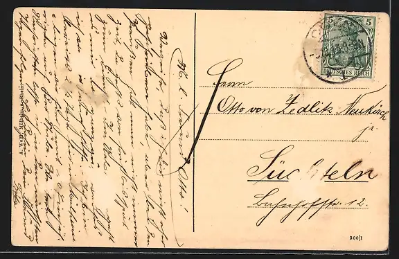 alte Ansichtskarte, gelaufen, rückseitig Oberflächenschaden, Eckknick unten links, guter Zustand