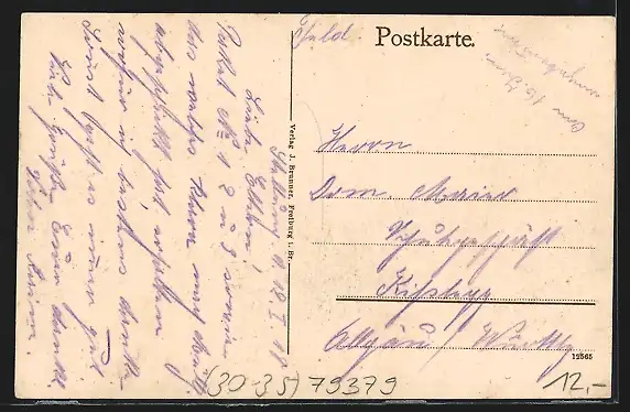 Personenbezogene Daten auf der Rückseite der Karte wurden durch blauen Textmarker unkenntlich gemacht. Die blauen Stellen sind auf die Vorderseite durchgeweicht und wirken sich negativ auf das Postkartenfoto aus