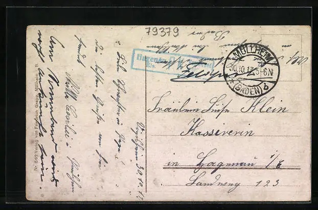 Personenbezogene Daten auf der Rückseite der Karte wurden durch blauen Textmarker unkenntlich gemacht. Die blauen Stellen sind auf die Vorderseite durchgeweicht und wirken sich negativ auf das Postkartenfoto aus
