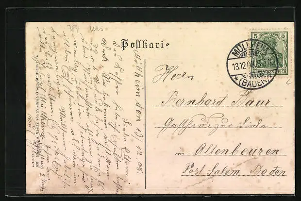 Personenbezogene Daten auf der Rückseite der Karte wurden durch blauen Textmarker unkenntlich gemacht. Die blauen Stellen sind auf die Vorderseite durchgeweicht und wirken sich negativ auf das Postkartenfoto aus